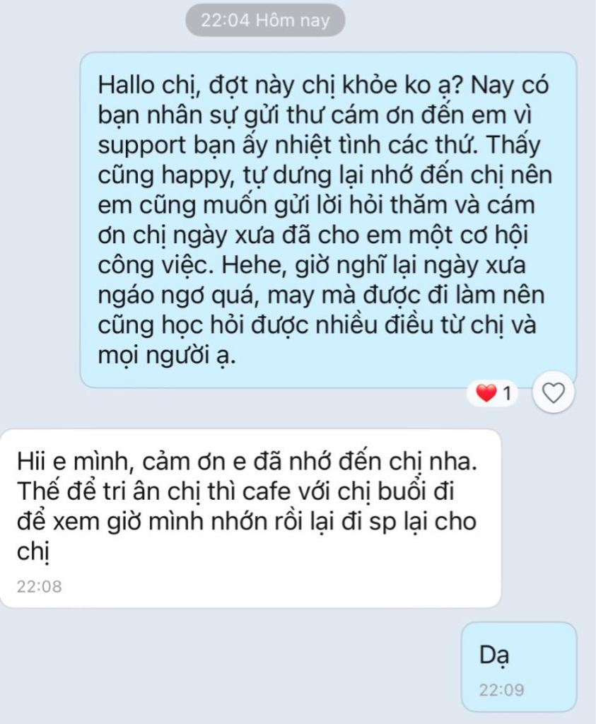 Tự dưng, mình nhớ lại chị sếp official đầu tiên của mình. Cuối năm nhất, vu vơ comment ở trên Facebook thì chị ấy thấy nên inbox hỏi có muốn đi làm không. Mình lúc ấy đã rất hào hứng như vớ được vàng, call 5p rồi mình gửi CV rồi chị bảo hôm nào đi làm được, và ngay sáng hôm sau nữa mình đến đi làm. Từ giờ mình sẽ kỉ niệm ngày đó còn hơn cả sinh nhật, hihe.